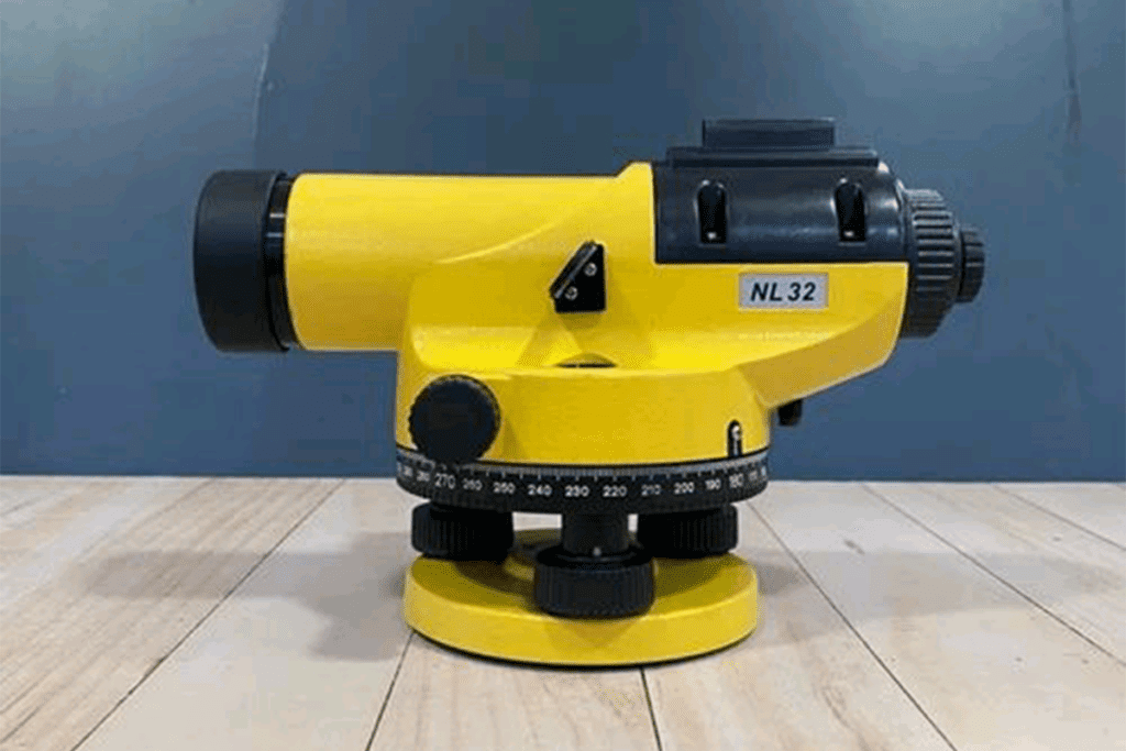 Precision equipment with a telescope and circular bubble, used in surveying and construction to measure or establish a horizontal plane.